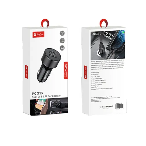 در قسمت بالایی شارژر فندکی PCG13 دو پورت خوجی از نوع USB طراحی و تعبیه شده است. از ویزگی های بارز در طراحی این کالا می توان به ساختار گوشه دار این شارژر فندکی پرووان اشاره کرد. یکی از کاربرد های ساده ولی مهم طراحی دکمه ها در طرفین شارژر که به راحتی در جایگاه فیکس می شود و جدا کردن آسان از بخش فندکی ماشین است.