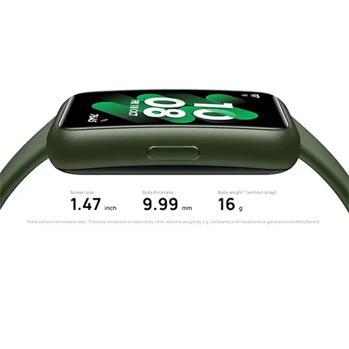 ضخامت ساعت هوشمند هواوی بند 7 9.99 میلی متر و وزن آن 16 گرم و ابعادی برابر 44.35x26x9.99 میلی متر دارد. این ضخامت و وزن آن را به باریک ترین و سبک ترین محصول بازار تبدیل کرده. جنس بدنه Band 7 از مواد پلیمری بادوام ساخته شده که مقاومت دستگاه را در برابر خط و خش بالا میبرد البته لازم به ذکر است که باید مراقب ضربات شدید به آن باشد.